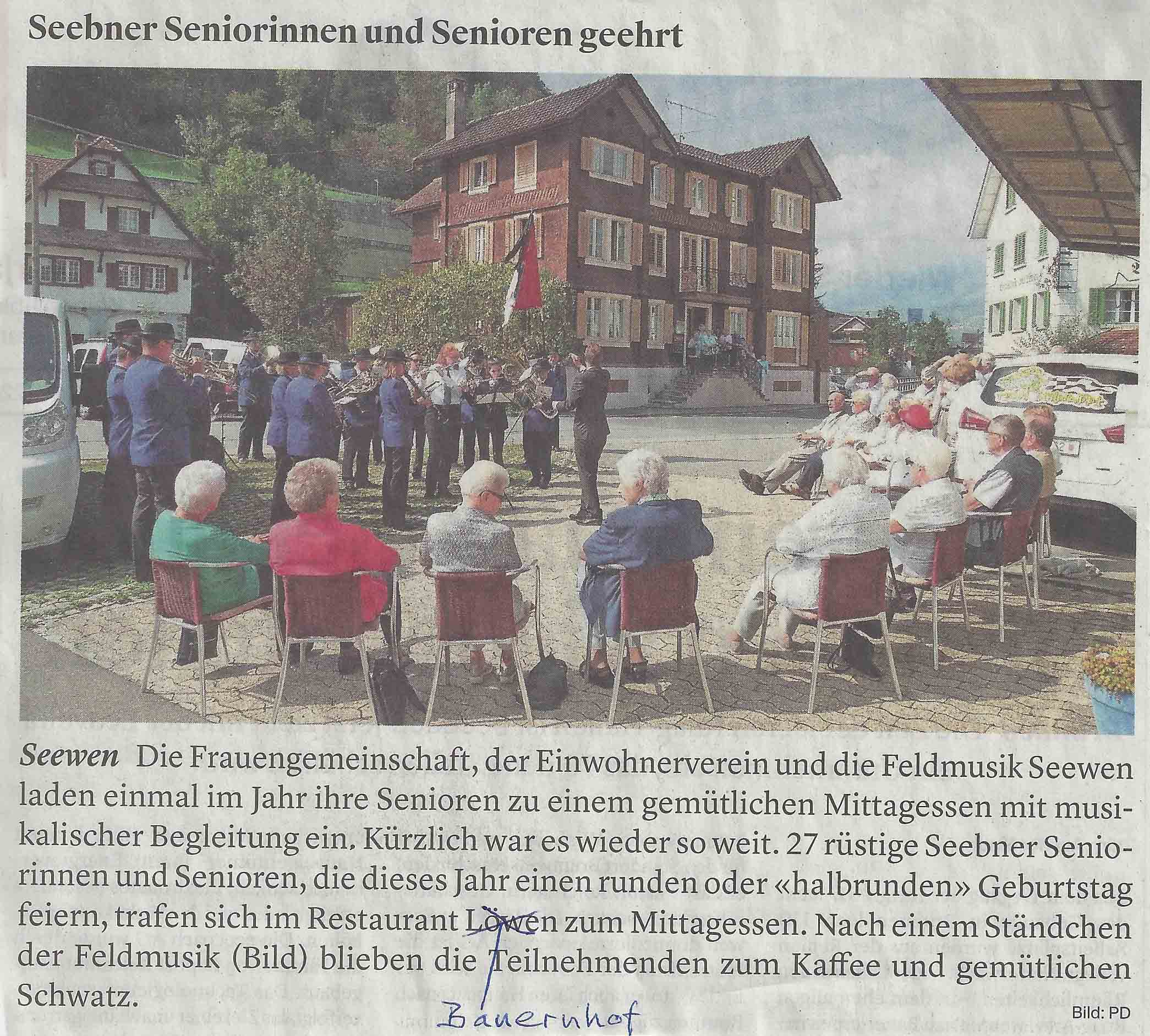 p. Der kommende Samstag, 15. September 2018, ist bei einigen Seebner Seniorinnen und Senioren rot in der Agenda vorgemerkt. Dann nämlich findet die traditionelle Altersehrung der 80-, 85-, 90-jährigen und noch älteren Seebnerinnen und Seebner statt. Dazu eingeladen haben die drei Vereine Einwohnerverein Seewen-Schwyz, Frauengemeinschaft Seewen sowie Feldmusik Seewen. Treffen tun sich die Jubilierenden im Gasthaus ‚Bauernhof’ in Unterseewen, wo sie im Beisein der Einladenden ein feines Mittagessen geniessen dürfen. Auch ein Ständchen der Feldmusik sowie für alle Anwesenden ein kleines Geschenk stehen auf dem Programm. Bis dato haben sich über ein Dutzend Jubilare zu diesem kleinen ‚Fest der Dorfweisen’ angemeldet. Den ‚Altersrekord’ der Geladenen stellt zurzeit die dorfälteste Mitbewohnerin, Frau Elsa Steiner-Bamert, (siehe Dorfnews vom 12.9.18) auf.