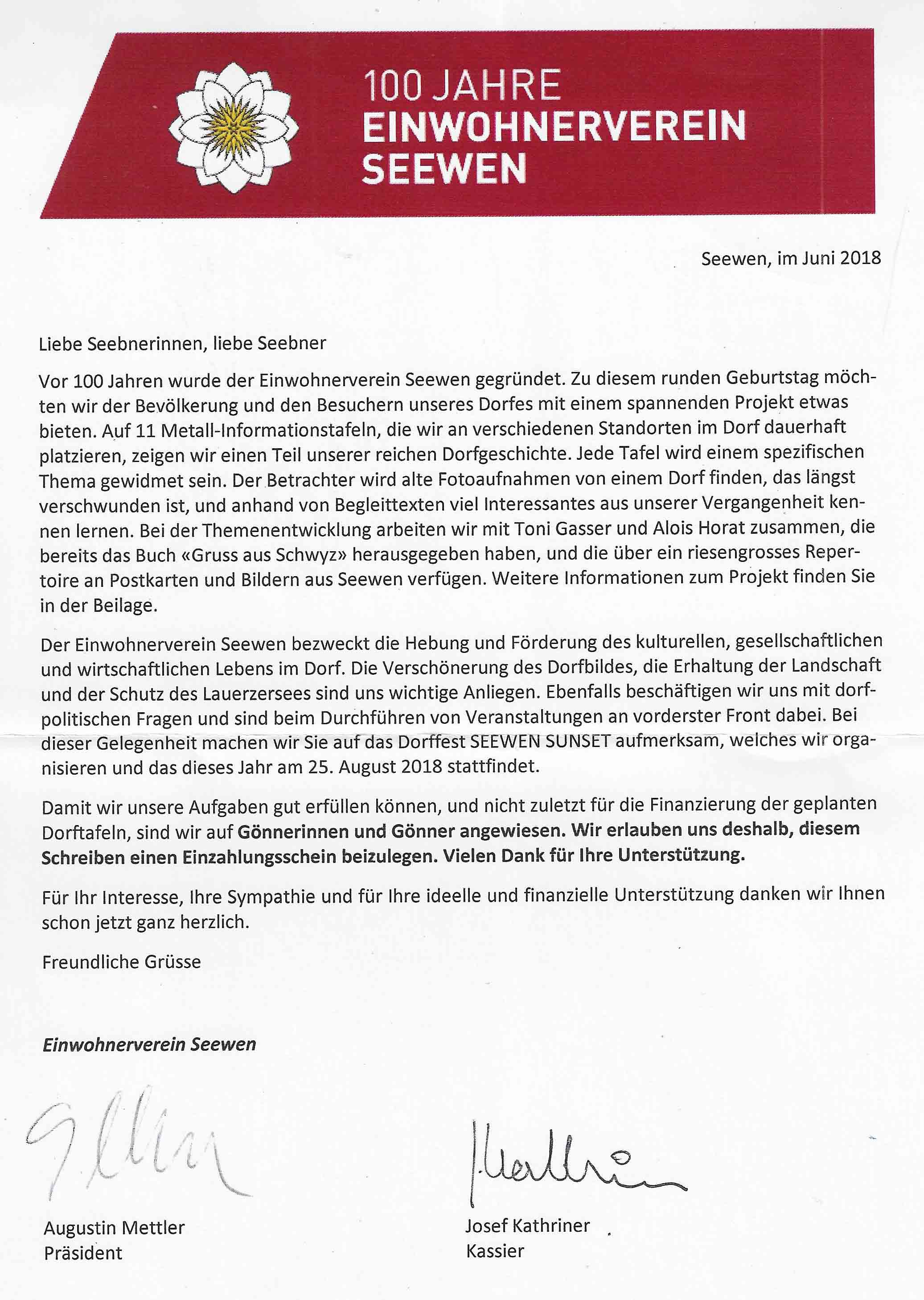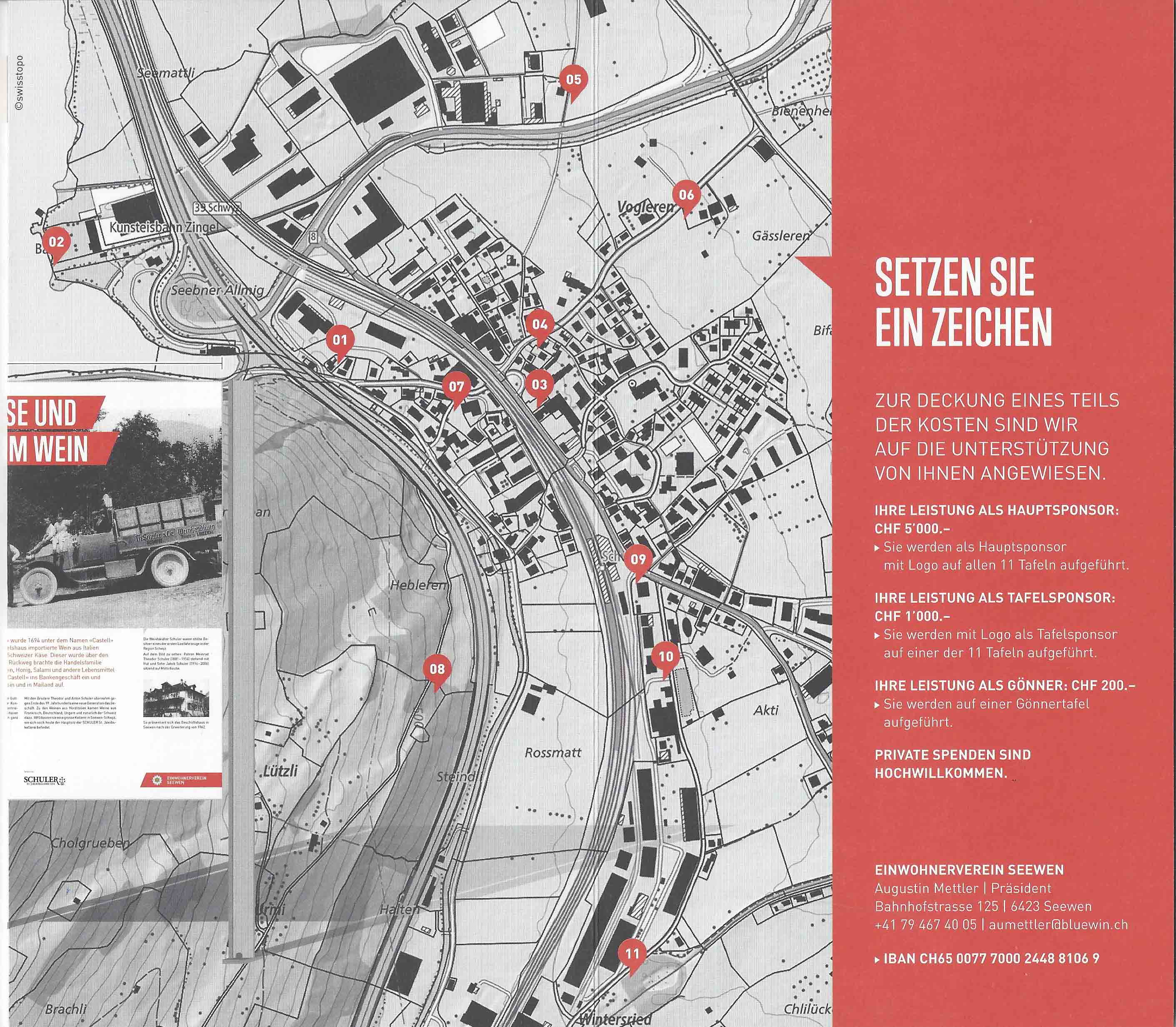 p. Wie an dieser Stelle bereits gemeldet, feiert der Einwohnerverein Seewen 1919 sein 100-jähriges Bestehen (Dorfnews vom 18.3.2018). Sich selbst möchte der Verein zum Geburtstag ein riesiges Geschenk machen: einen historischen ‘Lehrpfad’ durch das Dorf.