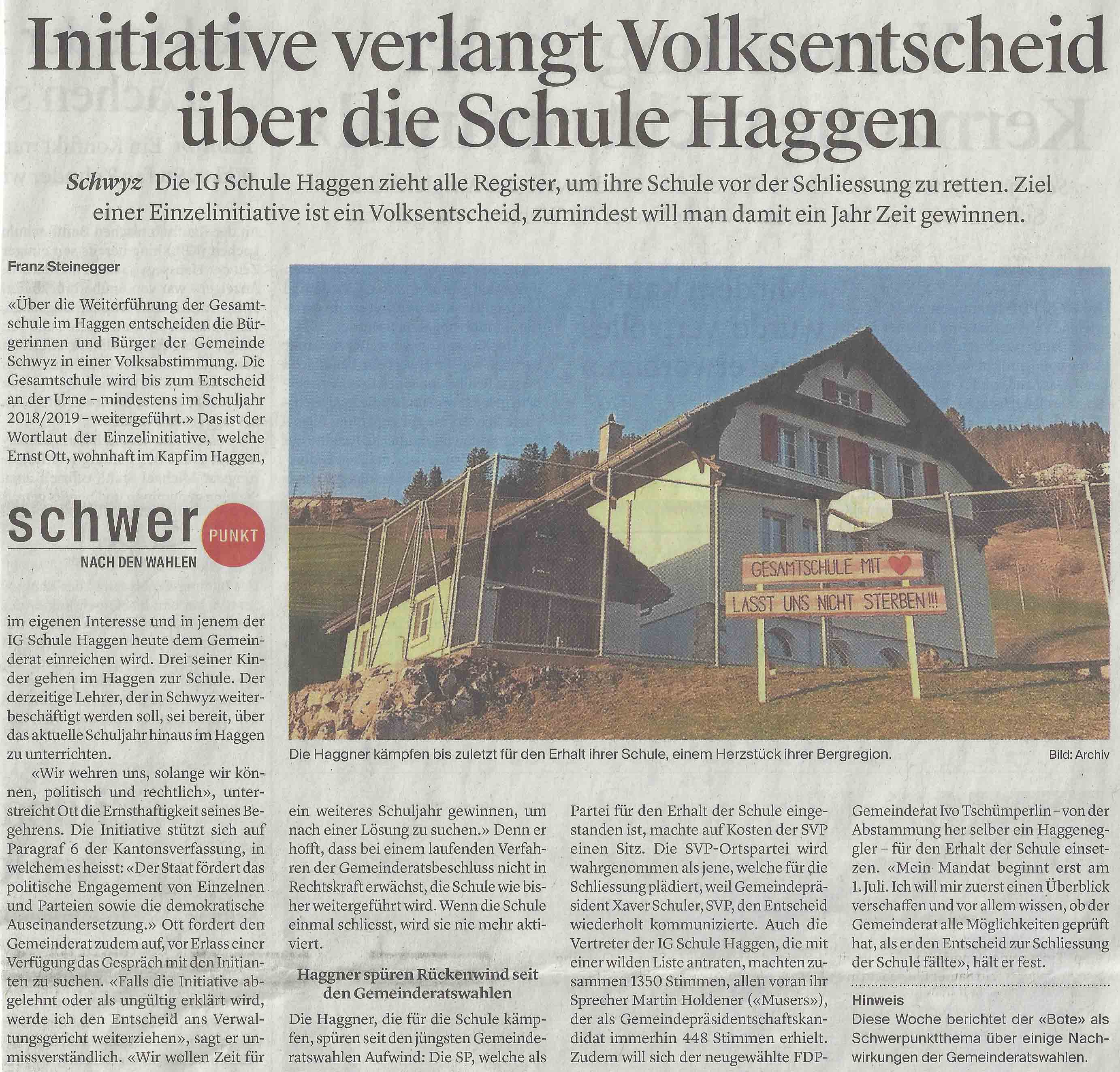 p. Es ist das letzte Mittel, welches die Befürworter eines Schulbetriebes im Weiler Haggen weit oberhalb Seewen noch haben: die Einzelinitiative. Nachdem der Schwyzer Gemeinderat mehrmals seinen Schliessungsentscheid betonte (siehe Dorfnews u.a. vom 12. April und 8. April), greifen die Befürworter der kleinen Bergschule zum letzten demokratischen ‘Strohhalm’. Dies jedenfalls wusste die Regionalzeitung ‘Bote der Urschweiz’ seiner Leserschaft am 27. April 2018 zu berichten: