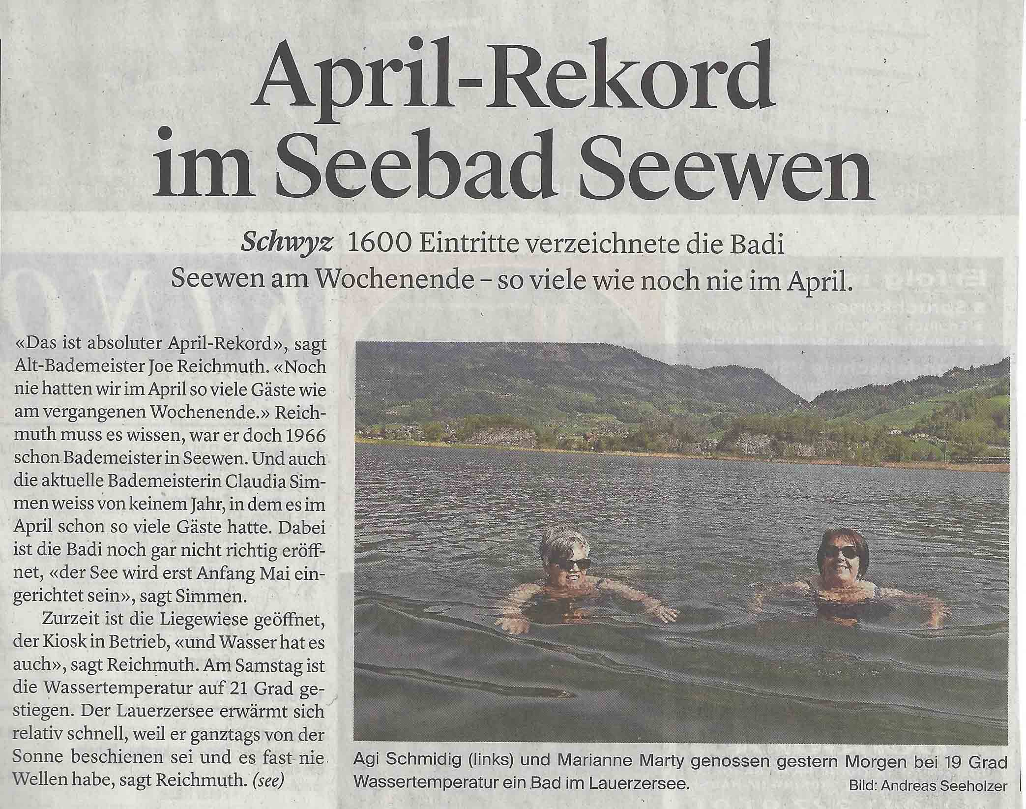 p. Das unglaublich warme Frühlingswetter treibt nicht nur die Blüten aus den Knospen, sondern auch die Menschen aus ihren Unterkünften. Landauf landab hält sich die Bevölkerung im Freien auf und geht mit der Natur auf Tuchfühlung. Das ist am und im Lauerzersee nicht anders: er wird zurzeit von Menschen geradezu belagert. Am vergangenen Wochenende war dies einmal mehr krass der Fall: hunderte Sonnenhungrige folgten dem Ruf der Natur und begaben sich ins Freie. Während die einen einen Ausflug in die Höhe taten, besuchten andere wiederum die Seeufer – verbunden sogar mit einem Abstecher in den recht aufgewärmten See. Die ‚Badi Seewen‘ jedenfalls wurde fast überrannt, obwohl sie die Türen der Saison 2018 noch offiziell gar nicht geöffnet hat… Ihren ersten grossen Auftritt wird sie am kommenden Wochenende haben, wenn die internationale Ruder-Regatta auf und am Lauerzersee ausgetragen wird.
