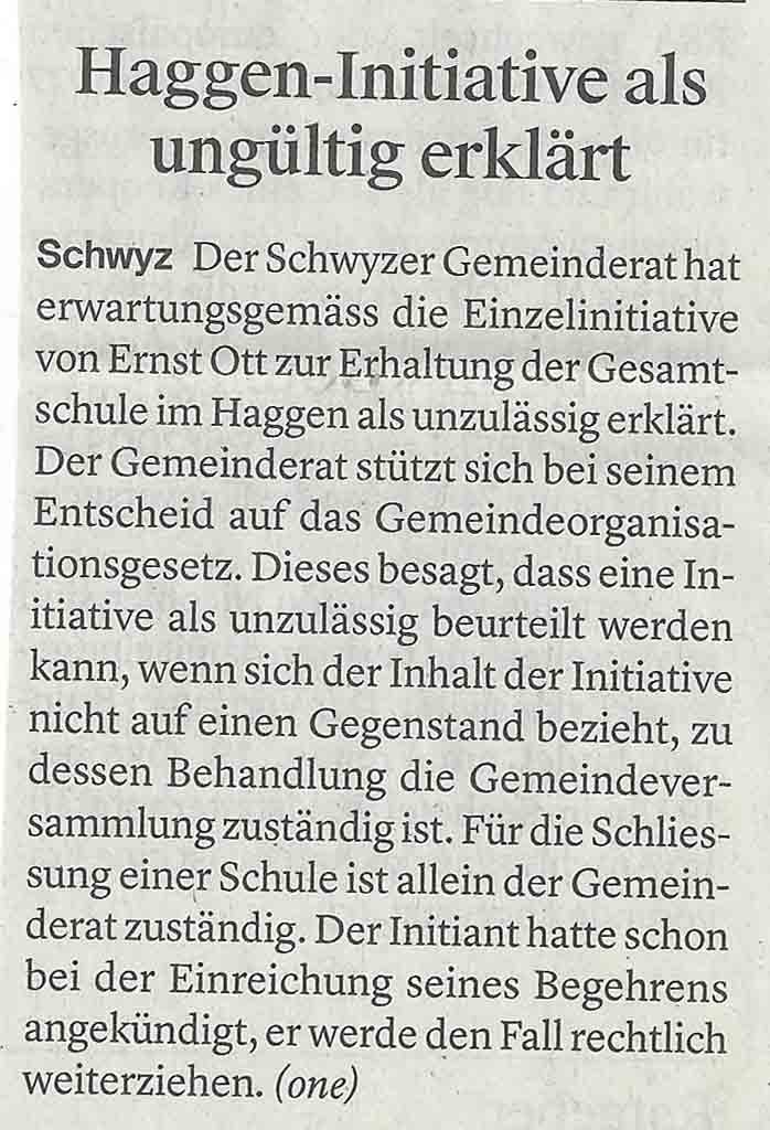Es ist keine Ueberraschung: der Gemeinderat Schwyz hat Ende Mai 2018 entschieden, dass die Initiative zum Erhalt der Schule Haggen unzulässig sei. Dies wusste der "Bote" seiner Leserschaft am 1. Juni 2018 zu berichten: