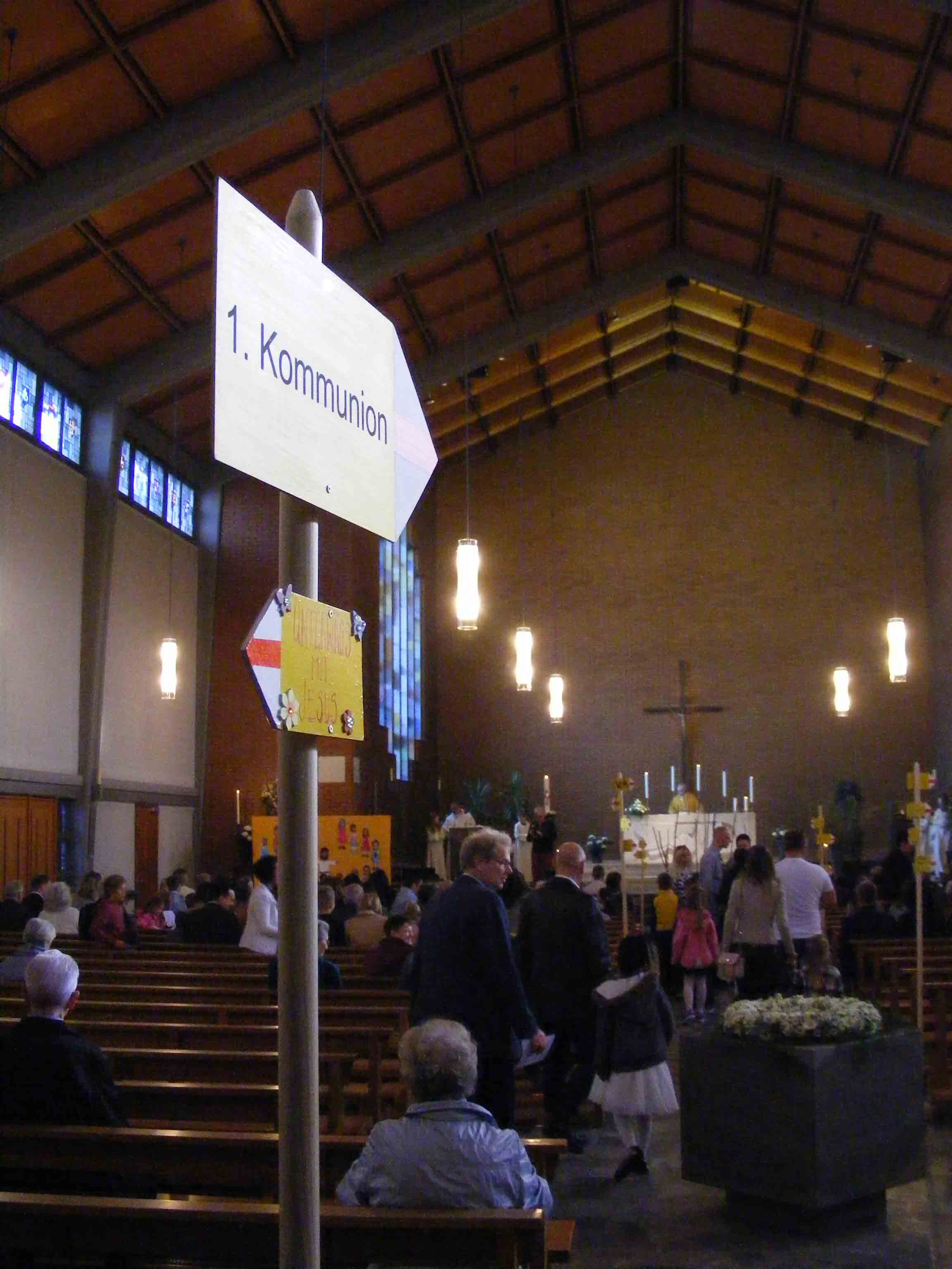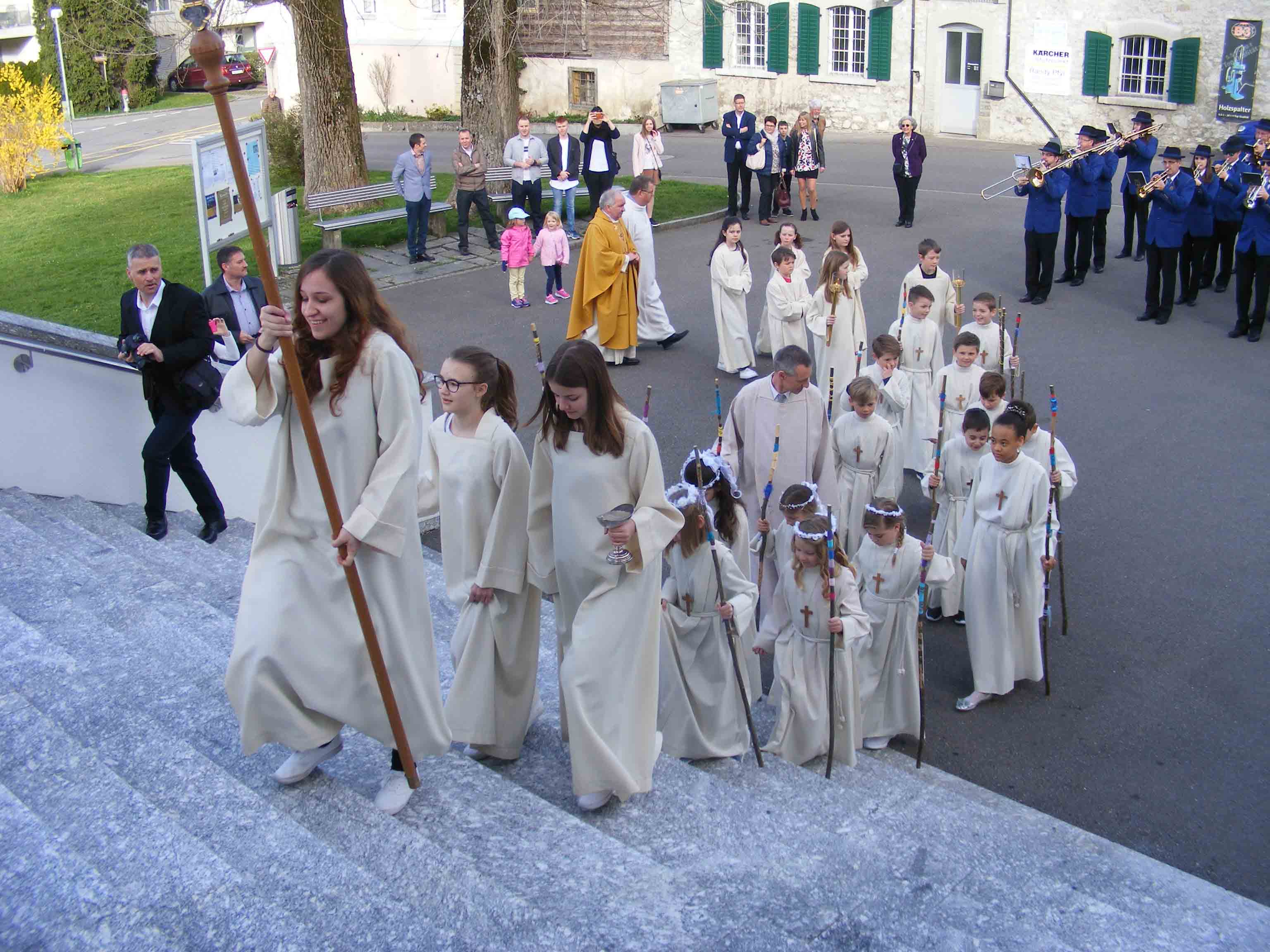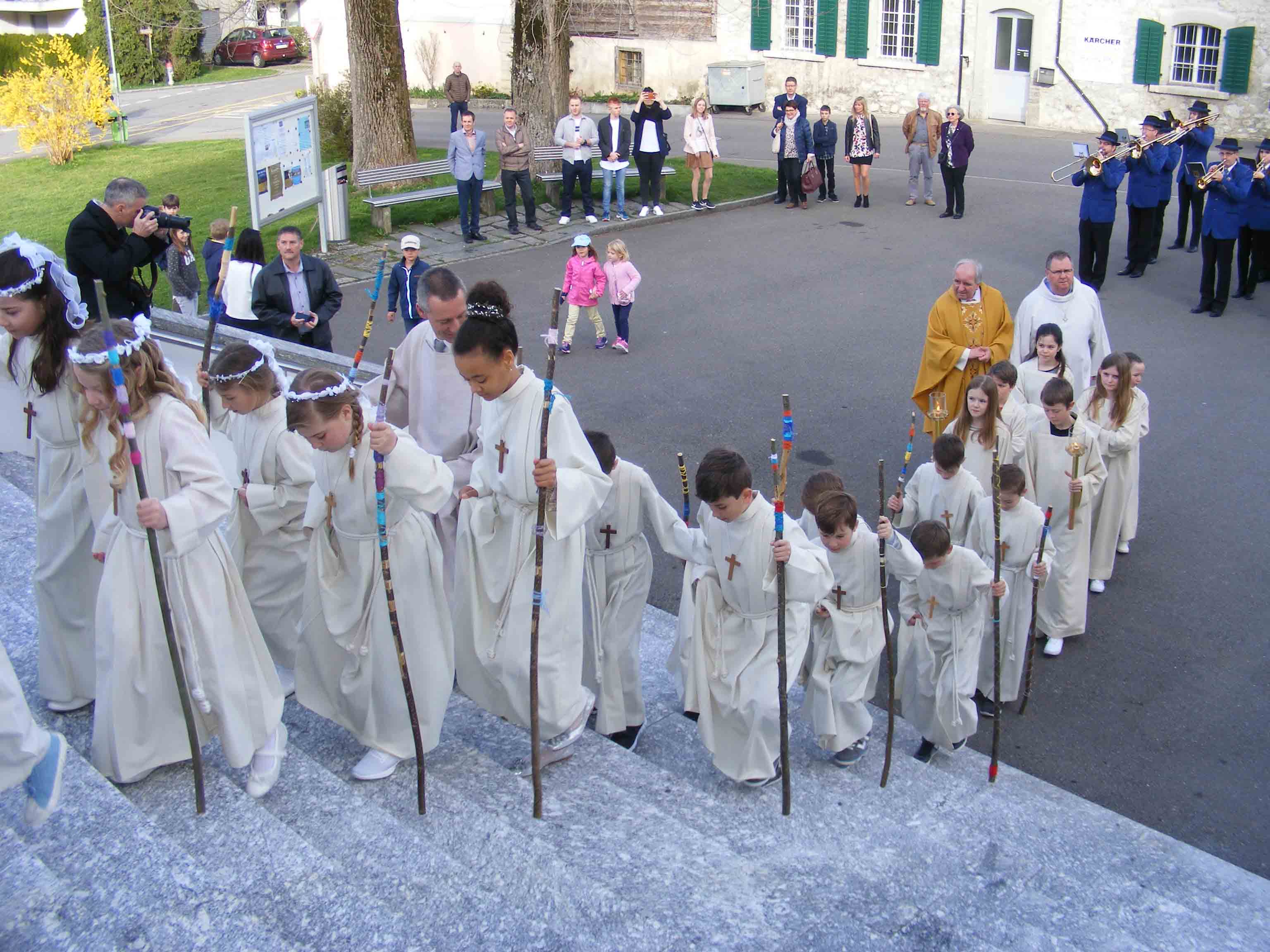 Besammlung, Einzug in die Kirche, Gottesdienst mit der feierlichen Erstkommunion in der Pfarrkirche und zum Schluss ein Volksapéro