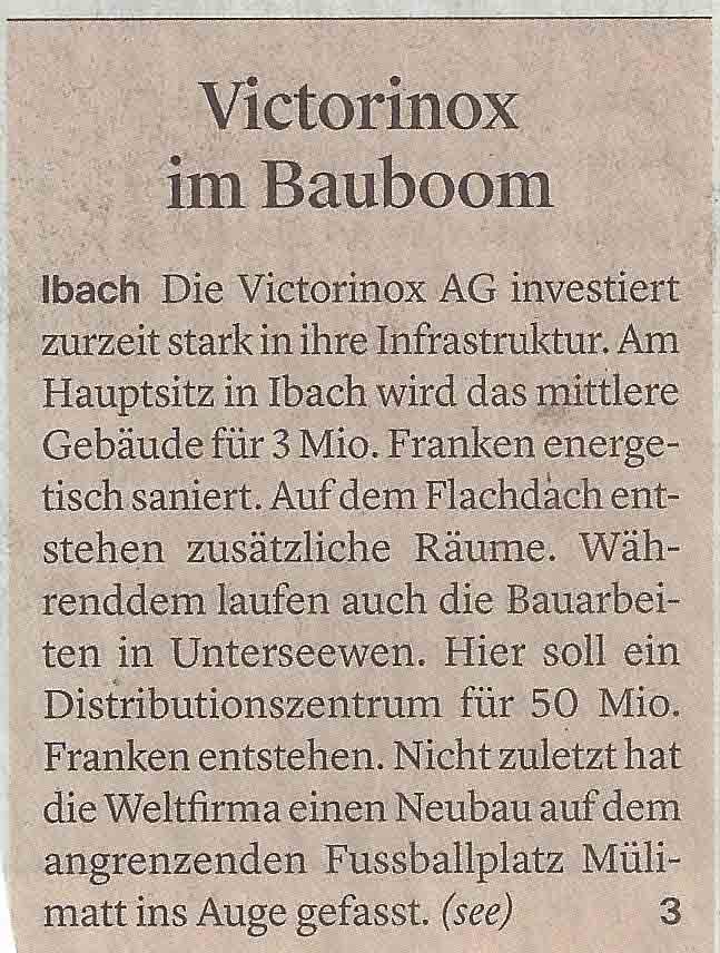 p. Die bisherigen Gebäulichkeiten auf dem Areal der Victorinox-Gruppe im ‘16ni’ im südlichsten Teil von Seewen sind so gut wie alle abgerissen und entsorgt, die Planierungsarbeiten (Humus) witterungsbedingt gut vorangekommen. Kurzum: auf der Grossbaustelle der ‘Victorinox’ in Seewen tut sich ‘was! Aber nicht nur da, sondern auch am Hauptsitz in Ibach sind viele Bauarbeiter auszumachen. Der Grund ist einfach: die Firma investiert kräftig in die Immobilien, man will für die Zukunft gerüstet sein. Der ‘Bote’ hat jüngst bei der Messerfabrik nachgefragt, um in Erfahrung zu bringen, wo sich denn konkret die grössten Baustellen befinden. Nachstehend die Antworten: