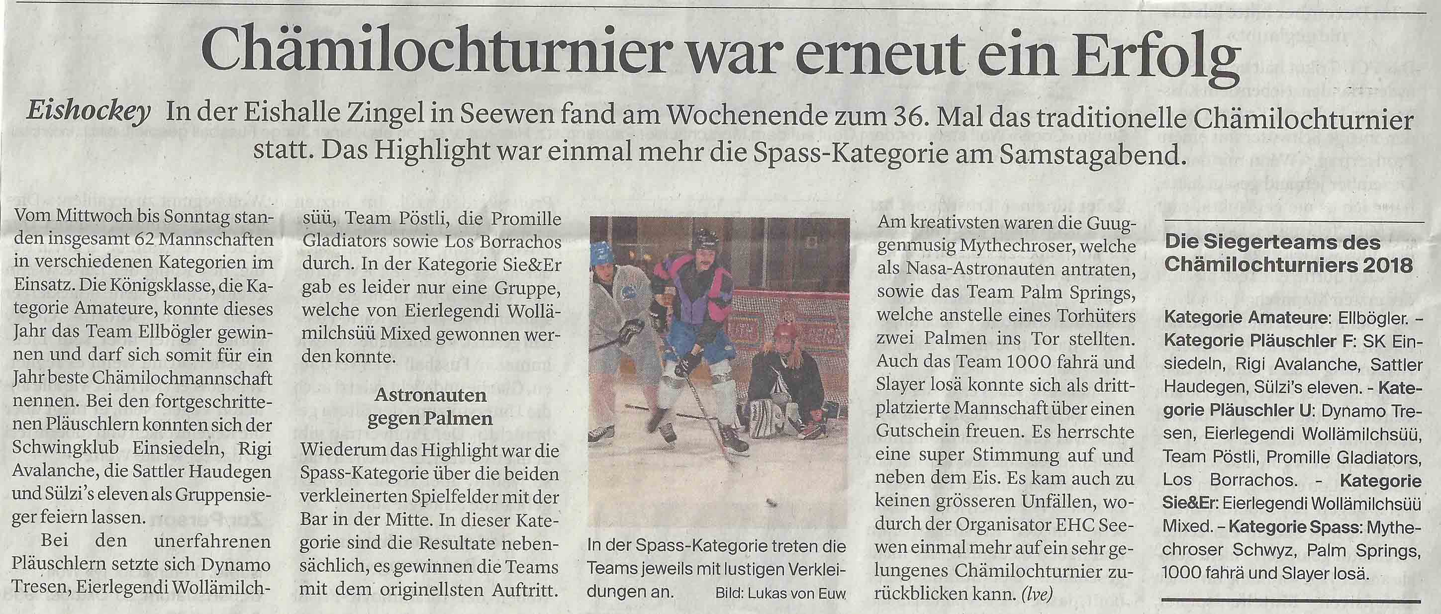 p. Es ist bald wieder soweit. Am Mittwoch, 14. März 2018, wird zum ersten Spiel des 36. Plausch-Hockeyturniers unter den Namen ‘Chämilochturnier‘ im Stadion ‚Zingel‘ angepfiffen. Wie jedes Jahr steht während des ganzen Turniers der Faktor ‚Plausch‘ im Mittelpunkt. Wochenlang lief das Anmeldeprozedere, gemeldet haben sich dazu schliesslich 62 Mannschaften. Im Mittelpunkt des grossen Plausch-Turniers steht aber ganz klar der Faktur ‘Spass’. Das Turnier dauert über eine Zeitspanne von einer Woche, gilt doch die letzte Woche ausgetragene ‘Zingel-Trophy’ quasi als Vor-Turnier des ‘Chämilochturniers’. Bei diesem spielten 14 Teams mit, als Sieger ging das Team ‘SpVgg Rothenthurm’ vom Eis, vor den ‘Seewenatics’ und den Cardinaldos.