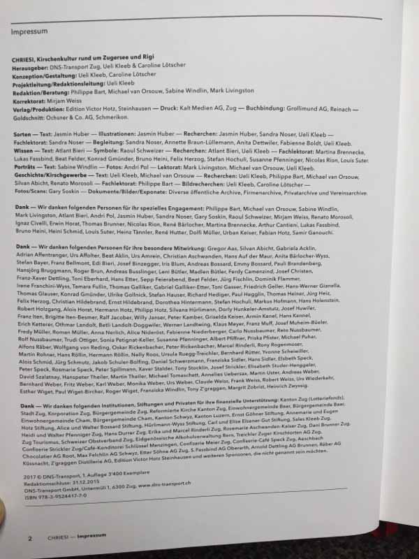 Das Buch in Stichworten: Alles übers Chriesi – 600 Jahre Kirschenkultur auf 600 Seiten ; 6 Kapital Wirtschafts-, Gesellschafts- und Kulinarikgeschichte; 45 Chroniken von Kirschdestillerien aus 200 Jahren; 1000 Bilder zu Geschichte und Gegenwart; 49 Porträts von 70 Menschen; 20 Kapitel Wissen zu Kirschen, Kirschbäumen und Verarbeitung; 15 wissenschaftlich illustrierte Kirschensorten; 8 Statistiken zu Kirschbäumen und Brennereien; 100 historische Kirschenrezepte; 2000 Abbildungs- und Quelleneinträge.