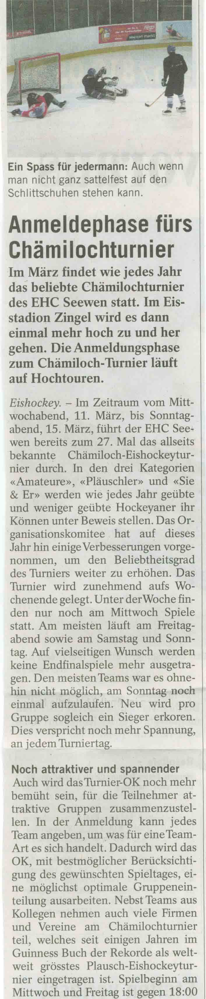 p. Es sind die letzten Tage Einige ‘vertschlipft’ bzw. ausgerutscht, aber dafür waren nicht die eisigen Temperaturen während der 5. Jahreszeit der Fall. Vielmehr dürfte Sanktus Spiritus seinen Beitrag dazu geleistet haben, dass nicht Alles so rund lief, wie es hätte sollen… Doch wie dem auch sei, ‘vertschlipfen’ werden auch bald wieder nüchterne Zeitgenossen. Dann nämlich, wenn ein OK um den EHC Seewen eine weitere Ausgabe des beliebten ‘Chämilochturniers’ im Stadion ‘Zingel’ durchführt. Die Anmeldefrist zu diesem weltgrössten Plausch-Hockeyturnier mit starkem Ortsbezug läuft am 15. Februar 2018 aus. Wer in einer der Kategorien mitmachen will tut gut daran, sofort das Anmeldeformular ab der Homepage des EHC Seewen herunterzuladen (www.ehcs.ch). Plausch auf und neben dem Kunsteis ist garantiert…