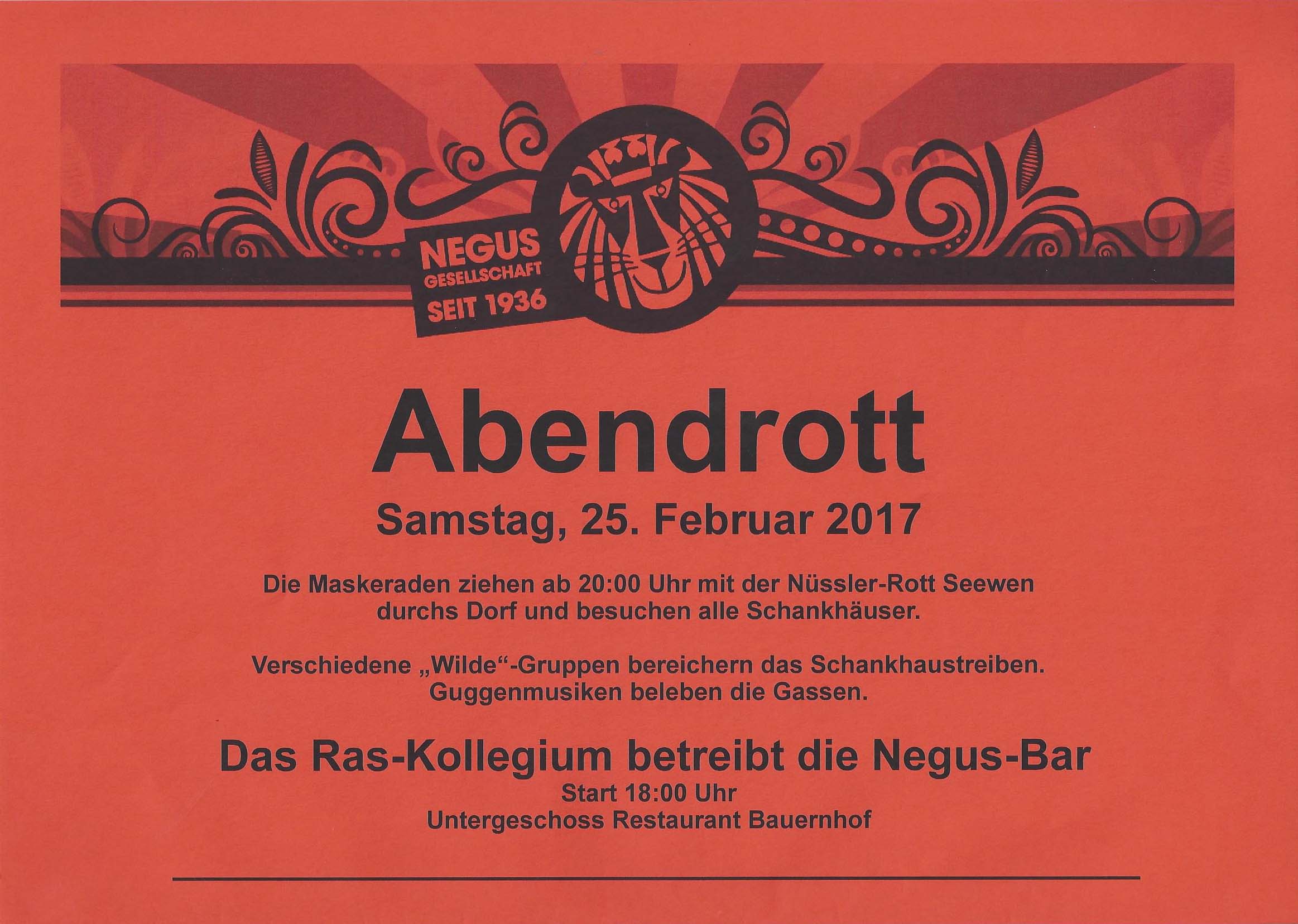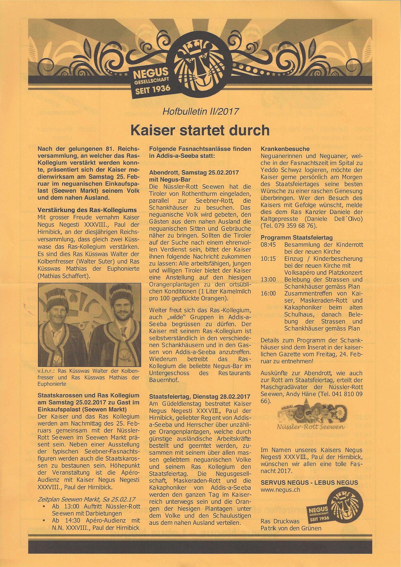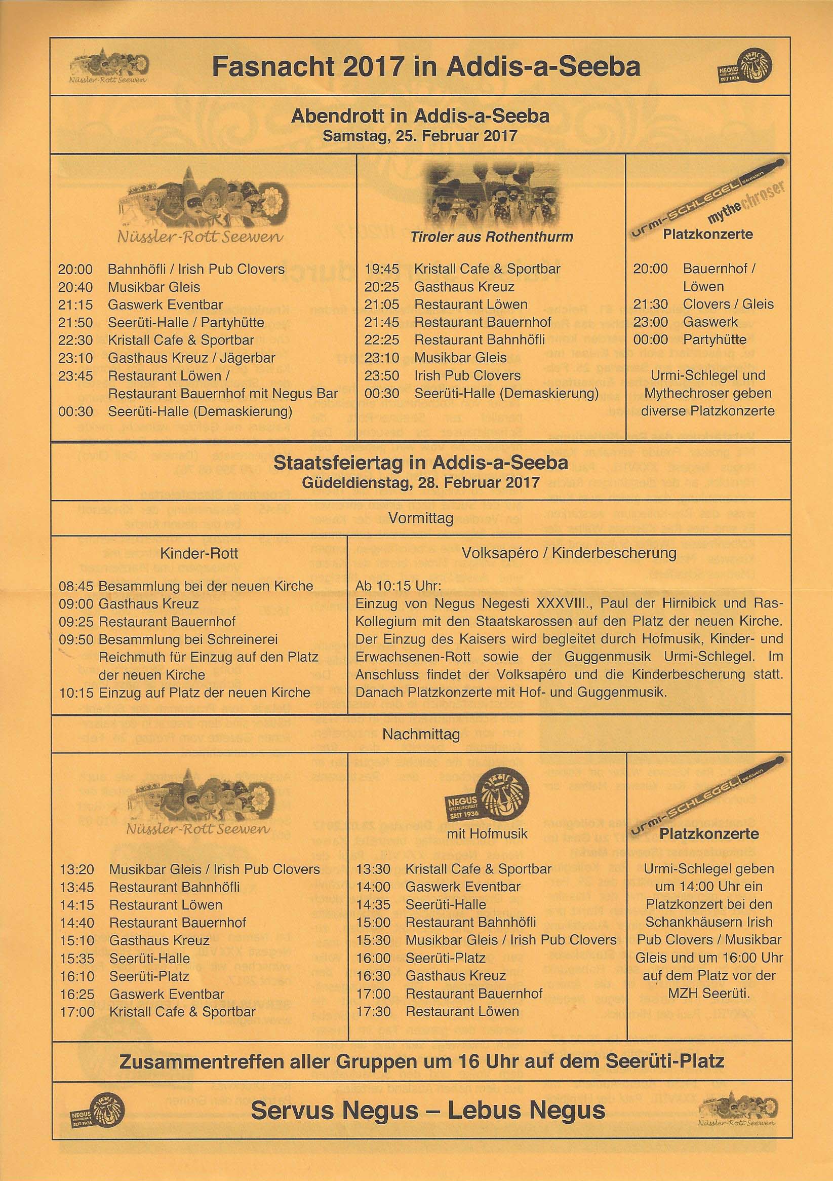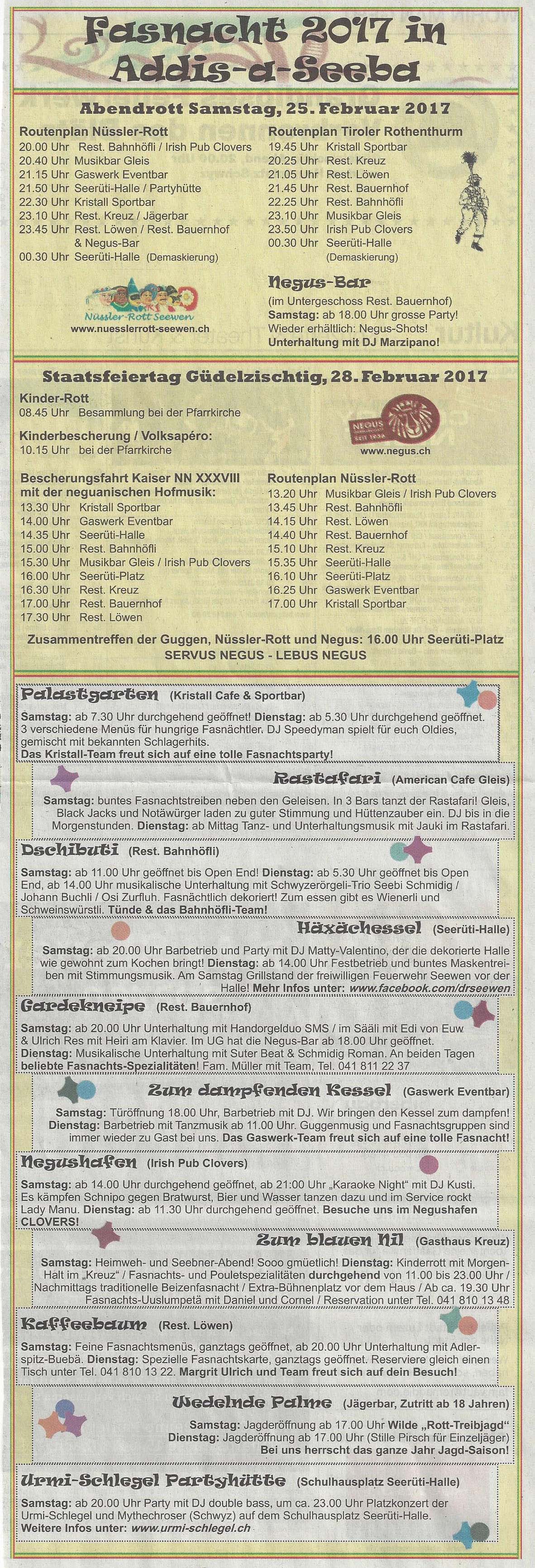 p. So soll es an der Fasnacht sein: ausgelassen und fröhlich! Zwei der Fasnacht tragenden Gruppierungen in Addis-a-Seeba - die Negusgesellschaft und die Nüssler-Rott Seewen -feierten am Samstag (25.2.2017) einen ersten grossen Auftritt. Das Detailhandelsunternehmen Coop lud die älteste Seebner Fasnachtsvereinigung zu einer Präsentation im SeewenMarkt ein. Die Einladung wurde gerne angenommen, eine Grosszahl des Ras-Kollegiums stand dem Publikum für Auskünfte jeglicher Art zur Verfügung. Den Blick auf sich aber zogen nicht die Mannen in den sandfarbenen Gewändern, sondern die Staatskarosse, die hochglänzend bei der Haupteingangspforte stand… Wenige Stunden später folgte dann der ‘Startschuss’ der andern Fasnachtsgruppierung zur Abigrott. Eine grosse Zahl Maschgraden in den sechs Original-Fasnachtsgwändli machte sich in Begleitung von Tambouren auf den Parkour durch Addis-a-Seeba und intrigierte in den Schankhäusern auf ‘Teufel-komm-raus’. Auch unterwegs war die Gastgruppe ‘Tiroler Rothenthurm’, dann Gruppen von Hühnern, Hexen, Köchen, Bäckern, Vampiren und Wasweissichnochwas. Um Mitternacht beruhigte sich das Treiben in den vielen Schankhäusern ein wenig, weil sich der Grossteil der Fasnächtler in die Mehrzweckhalle ‘Seerüti’ begab, um dort den Abend ausklingen zu lassen.