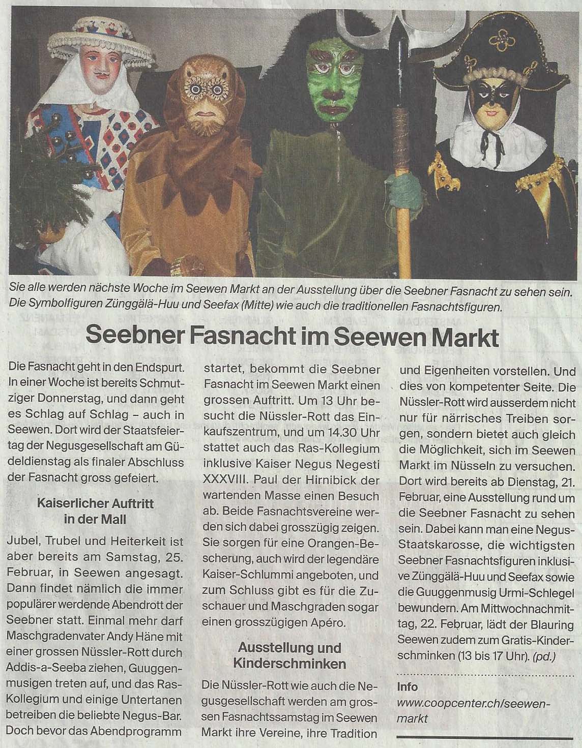 Zweifelsohne gilt die anstehende ‘Abigrott’ mit all ihrem Zugehör zu den Eckpfeilern der Seebner Fasnacht. Wenige Stunden davor findet heuer ein weiteres Highlight statt. Die Seebner Fasnächtler treten im Coop SeewenMarkt auf, wie verschiedenen Gazetten entnommen werden konnte. Die eigentliche ‘Abigrott’ startet dann wenige Stunden später zu ihrem Rundlauf durch die Strassen und Wirtshäuser…