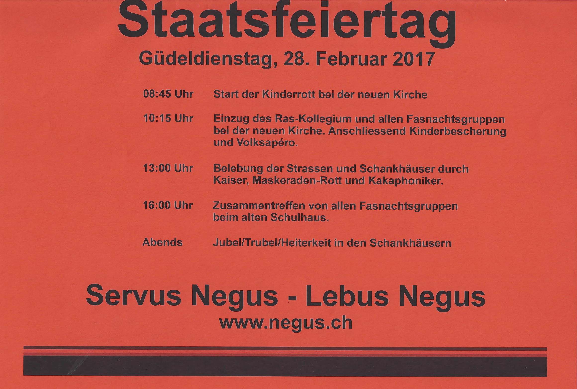 Die samstägliche Fasnachtsveranstaltung leitet fast nahtlos zum Staatsfeiertag am Güdeldienstag über. Im Zentrum dieses Tages: die Nüssler-Rott und die Fahrt des Kaisers mit Gefolge in den Staatskarossen über alle Fahrbahnen. Details hierzu liefern die verschiedenen Print-Erzeugnisse: