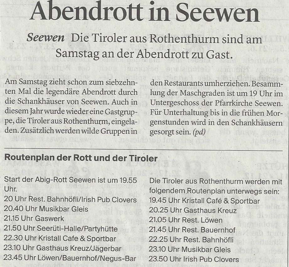 Sie wurde im Jahre 2000 erstmals lanciert, die ‚Abigrott Seebä‘. Das war revolutionär. Eine Abendveranstaltung mit einer Nüssler-Rott – undenkbar in dieser Zeit. Doch heute finden sich fast überall in der Gegend Nachahmer… Wer es auch erfunden hat, das ist nicht mehr so wichtig. Hauptsache: es fäged! (Auch das Preisnüsseln im Schwyzer Hauptort notabene ist vom Morgen auf den Abend rückverschoben worden.)